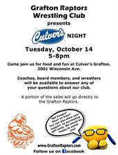 Culver's is donating a portion of their proceeds to Grafton Raptors Wrestling Club on Tuesday, October 14th. Please come by between 5 p.m. and 8 p.m. to grab dinner or a gift card. The wrestling coaches and board members will be there serving food and answering any questions you may have about wrestling. Come support your local youth wrestling team!